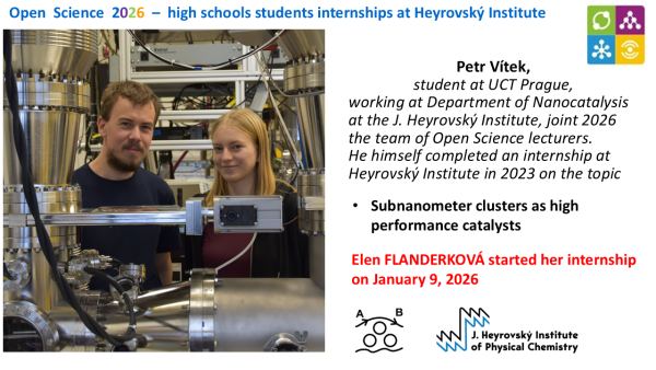 On January 9, 2026, Elen Flanderková, a second-year student at secondary school Gymnázium Omská in Prague, began her year-long scientific internship within the Otevřená Věda (Open Science) 2026 program. Under the supervision of Petr Vítek at the Department of Nanocatalysis at the J. Heyrovský Institute of Physical Chemistry (Czech Academy of Sciences), Elen will focus her research on atomically precise subnanometer clusters.